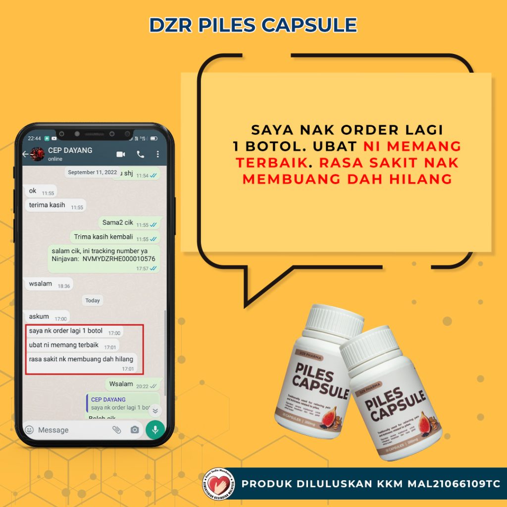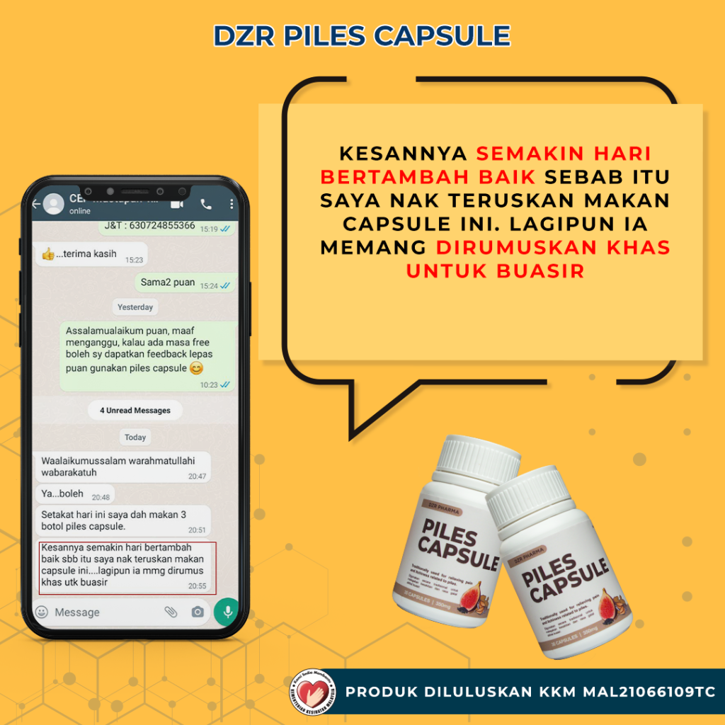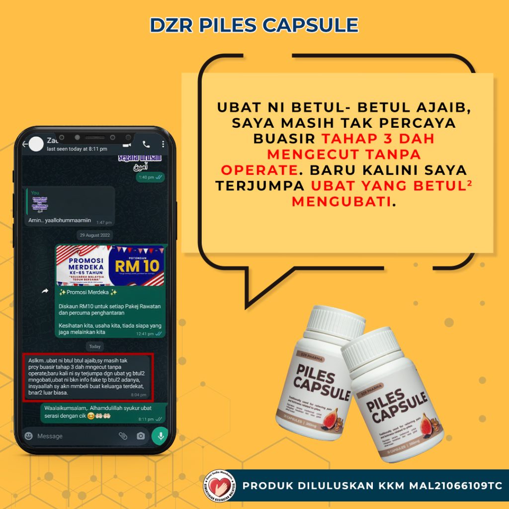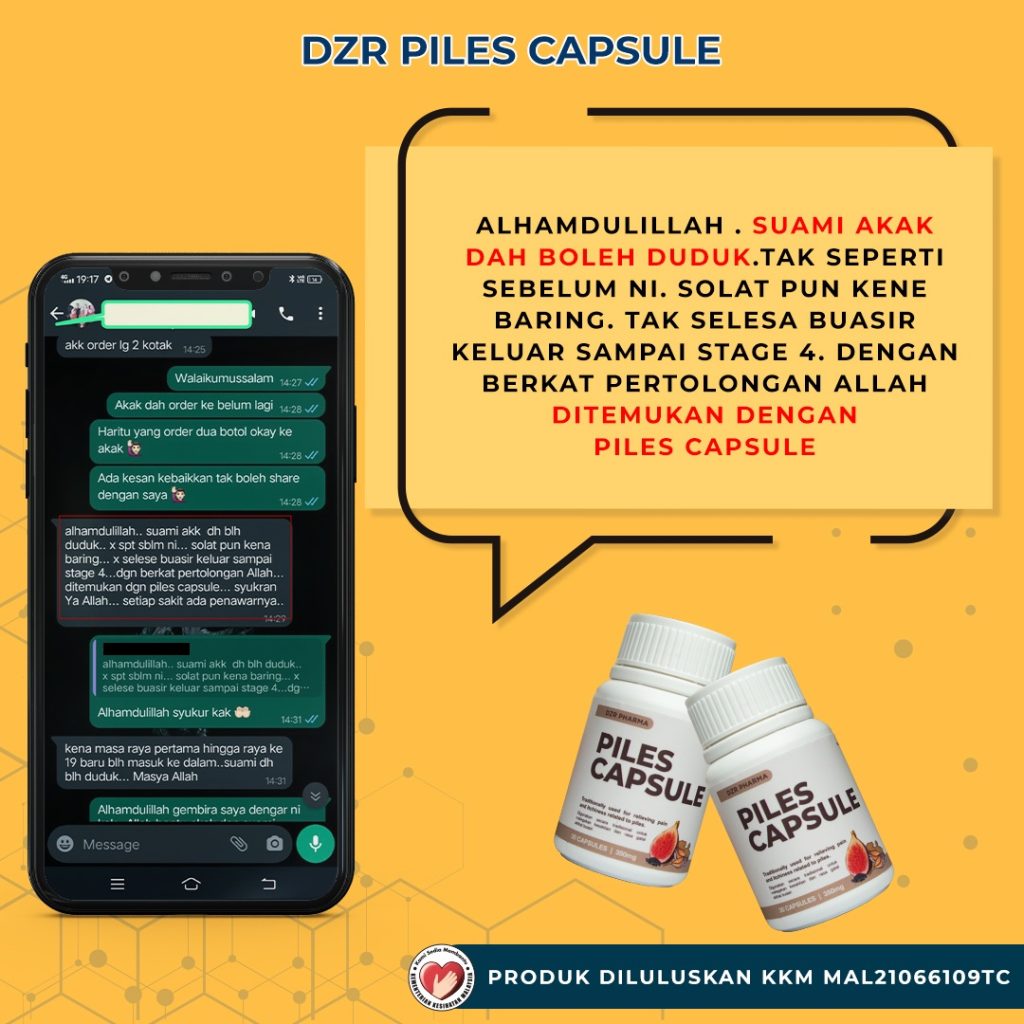 Saya mula tahu tentang Piles Capsule semasa saya menonton Selamat Pagi Malaysia (SPM) di TV1 . Kebetulan saya mempunyai masalah BUASIR. Setelah mencuba piles capsule ni dalam 4 hari saya mula rasa perubahan apabila esoknya saya membuang TANPA RASA SAKIT dan LANCAR. Saya dah lama menghidap Buasir dan berbelanja pun dah banyak. Rasa tak percaya pada mulanya mungkin sebab makanan yang saya makan, tapi esoknya pun sama, saya tak rasa sakit langsung ketika membuang. Memang Piles Capsule yang telah menyembuhkan saya. Saya sangat-sangat bersyukur dan Alhamdulillah.